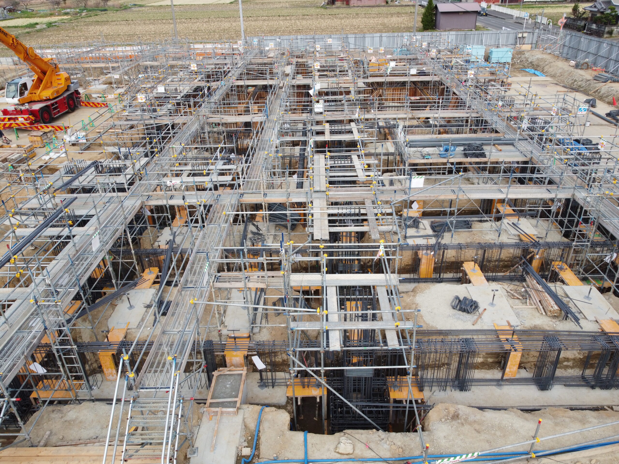 2025.03.27 磯城消防署移転新築工事 3月末時点の状況として、建築工事の基礎・地中梁の鉄筋および型枠工事を行っています。来月上旬より庁舎棟の1工区から2工区にかけて順次コンクリート打設を予定しております。 現場全景 手前:車庫棟、奥:庁舎棟 庁舎棟 基礎および地中梁の施工状況