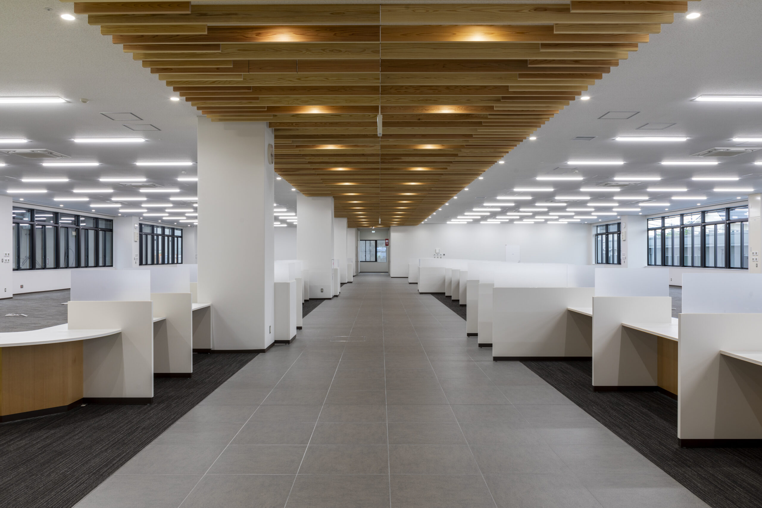 桜井市新庁舎新築工事 構造 S造・地上4階建て 延べ床 7840㎡ 所在地 奈良県桜井市粟殿 発注者 桜井市 設計 中尾・中和・渋谷・藤井・類・桝谷JV 監理 類設計 竣工 令和3年6月 建物は免震工法を採用しており、内装の天井・壁には桜井市内で製材した杉・桧をふんだんに使用しております。「木のまち」桜井市の新庁舎に一度足を運んでみてください。